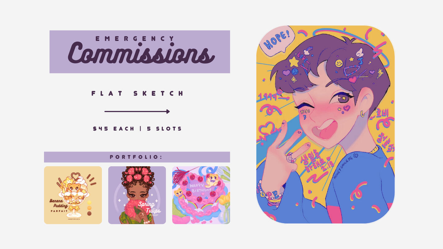 Clients must credit me as 'HoneySmileYG' wherever the artwork is used or showcased. I provide variants with and without credit on the artwork should a client not have the ability to type out credit.